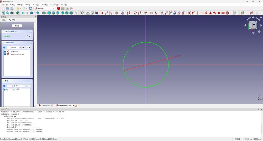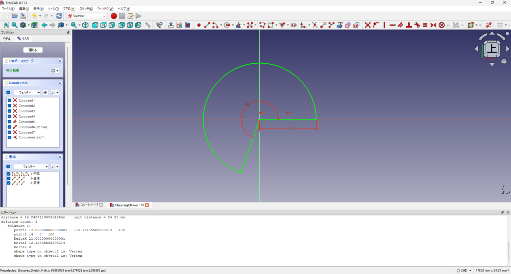 高さ調整の軸の周りに座面を支えるサポートを取り付けることにします。高さ調整の軸の直径は28mmでした。サポートの厚みを8mm、角度を250°として、FreeCADで作図しました。