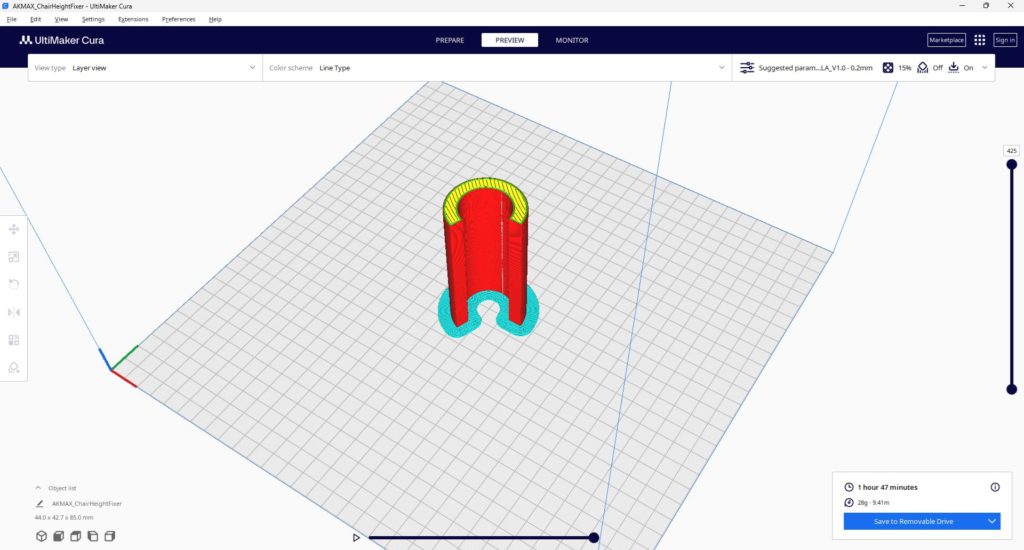 UltiMaker Curaで3Dプリンターの印刷データに変換、フィラメントの想定使用量は28gでした。